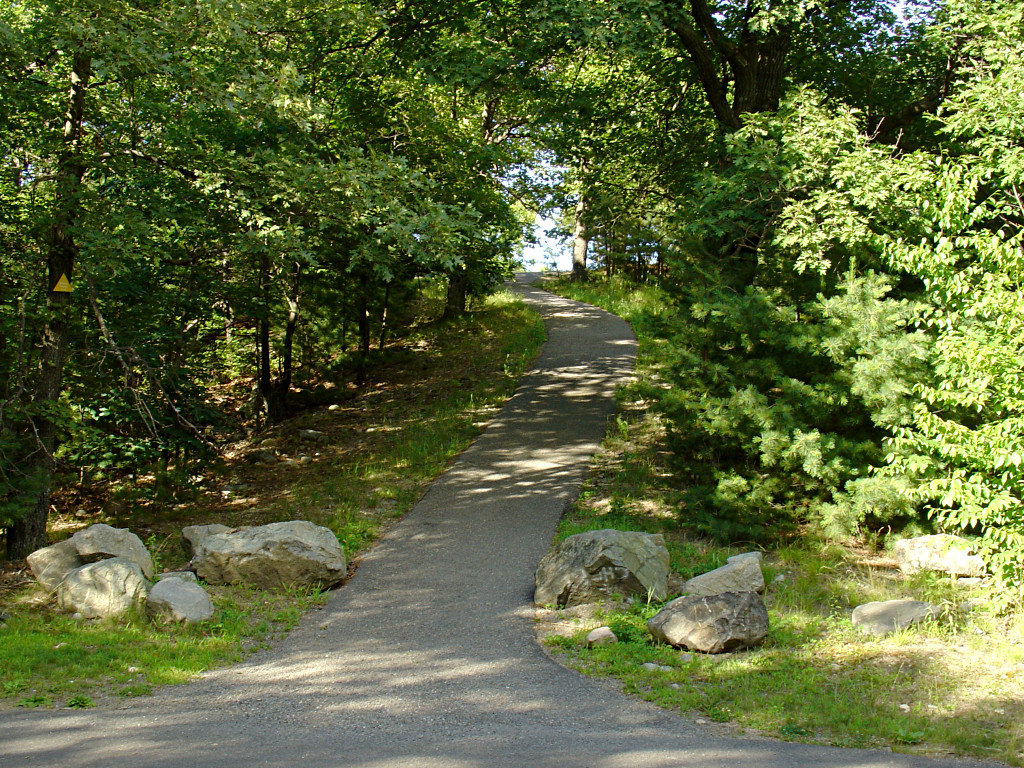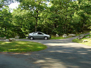 The entrance comes up VERY quickly as you're tearing down a curved hill and can't see it approaching. There are three driveways into the parking lot, so if you miss the first one you can recover and still turn in, but the actual beginning of the park road is waaay over at the right-hand [west] end of the lot.