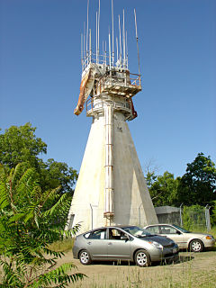 Up a little from the tanks is the top of the first hill, and this very weird thing on top of it -- also shown as a teepee type symbol on the Yahoo map. The tower may be old, but that's a forest of quite modern antennas on top, so it's clearly still active in some manner.